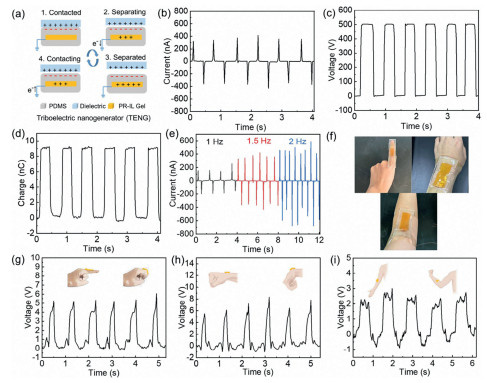 | Fig. 4. (a) Schematic illustration of the working mechanism of PDMS/1PR-IG triboelectric nanogenerator. (b) Isc; (c) Voc; (d) Qsc of the TENG at a frequency of 1.5 Hz. (e) Isc of the TENG at different frequencies. (f) Photos of the PDMS/1PR-IG TENG as self-powered sensors attached to different joints of finger, wrist, and elbow. The Voc signals of PDMS/1PR-IG TENG on the motion of (g) finger, (h) wrist, (i) elbow. | |