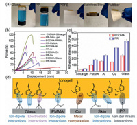 | Fig. 2. (a) Photos of the adhesion of PR-IG to glass, PP, PTFE, stainless steel, and rubber. (b) Lap shear curve and (c) corresponding adhesion strength of 1PR-IG and traditional gel (1% EGDMA) to silica gel, PMMA, Al, Cu and glass. (d) Possible adhesion mechanism of ionogel. | |