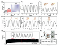 | Fig. 3. (a) Reciprocating ∆R/R changes of 1PR-IG strain sensor under different strains (20%, 50% and 100%). (b) ∆R/R changes of 1PR-IG strain sensor under reciprocating compression. ∆R/R changes of 1PR-IG wearable strain sensor during (c) finger bending, (d) elbow bending, (e) knee bending, and (f) throat movement. (g) ∆R/R changes of 1PR-IG strain sensor under 100% strain and 200 consecutive tensile-release cycles. (h) 1PR-IG conductive electrode for real-time detection of human ECG signals. | |