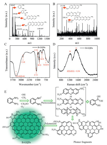 | Fig. 2. (A) MS of B-GQDs. (B) Secondary MS of ion peak with m/z of 1199.44. (C) FT-IR spectrum of B-GQDs. (D) Raman spectrum of B-GQDs. (E) Path diagram of photocatalytic synthesis of B-GQDs. | |