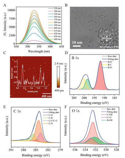 | Fig. 3. (A) PL emission spectra of B-GQDs under different excitation wavelengths. (B) HRTEM image of B-GQDs (2:1) (The illustration shows the lattice of a single B-GQDs). (C) AFM diagram of B-GQDs (the inset shows the cutting height distribution along the line). (D) B 1s, (E) C 1s and (F) O 1s high-resolution spectra of B-GQDs (2:1). | |