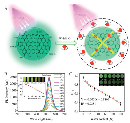| Fig. 4. (A) Schematic diagram of water content mechanism by B-GQDs. (B) FL spectra of B-GQDs for different water content in methanol (illustration shows the corrected working curve). (C) Linear curve of FL intensity of paper-based sensor for different water content in methanol. | |