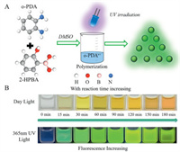 | Fig. 1. (A) Schematic diagram of B-GQDs synthesis. (B) Color change of the reaction solution under daylight and FL variation at different reaction times. | |