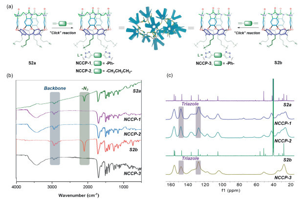| Fig. 1. (a) Synthesis of NCCP-1~3 and the cartoon illustration of the polymer structure. (b) FT-IR spectra of S2a, S2b, NCCP-1~3. (c) 13C NMR spectra of S2a, S2b and solid-state 13C NMR spectra of NCCP-1~3. | |