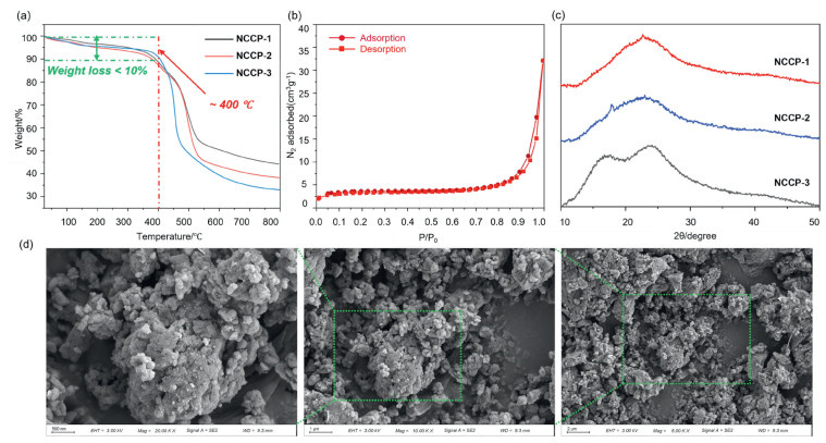 | Fig. 2. (a) TGA curves of NCCP-1~3. (b) N2 adsorption and desorption curves of NCCP-1. (c) PXRD spectra of NCCP-1~3. (d) SEM images of NCCP-1. | |