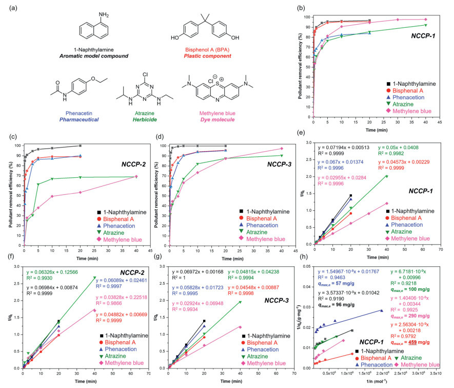 | Fig. 3. (a) Structures and classification of the selected organic micropollutants. (b-d) Time-dependent removal efficiencies for the adsorptive removal of micropollutants by NCCP-1~3. (e–g) Fits to the Ho and McKay’s pseudo-second-order model for the adsorption of micropollutants by NCCP-1~3. (h) Fits to the Langmuir adsorption isotherms for the adsorptive removal of micropollutants by NCCP-1. | |