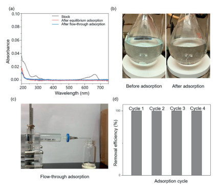 | Fig. 4. (a) UV–vis absorption intensities of the mixture of 5 pollutants in deionized water at environmentally relevant concentration and after equilibrium and flow-through adsorption by NCCP-1. (b) Pictures of pollutant solutions before and after adsorption from (a). (c) Experimental setup for flow-through adsorption. (d) Removal efficiency of each circulative adsorption experiment of NCCP-1 with BPA. | |