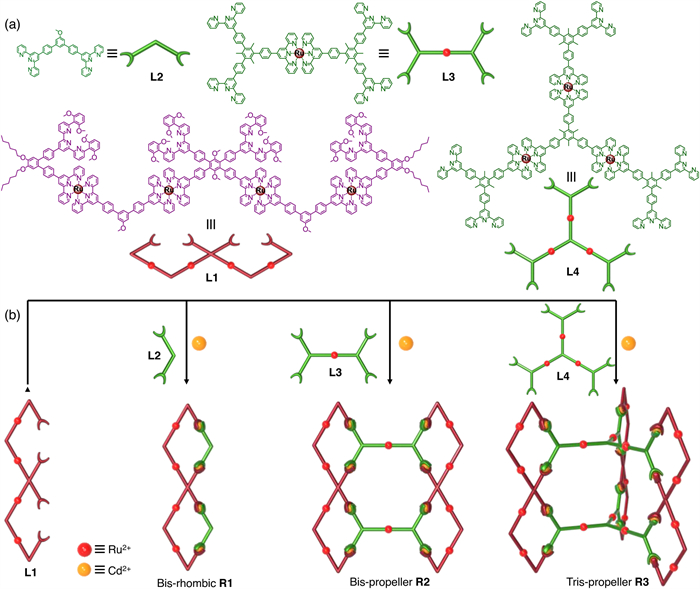 | Fig. 2. Mortise-and-tenon type ligands and their self-assembly. (a) Mortise-shaped building blocks L1 and tenon-shaped building blocks L2-L4. (b) Self-assembly of bis-rhombic supramolecule R1, bis-propeller supramolecule R2, and tris-propeller supramolecule R3. | |