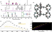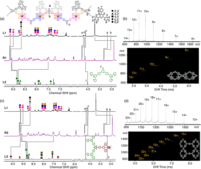 | Fig. 3. 1H NMR spectra (400 MHz, 298 K, CD3CN) of (a) L1, R1, and L2, and (c) L1, R2, and L3. ESI-MS spectra and TWIM-MS plots of supramolecules (b) R1 and (d) R2. | |