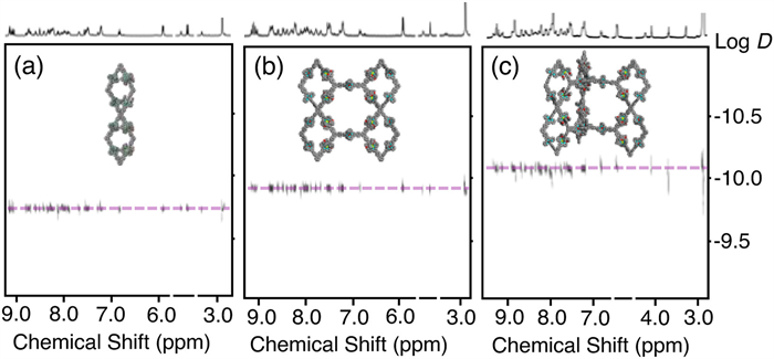 | Fig. 5. DOSY spectra (500 MHz, 298 K) of (a) R1 in CD3CN, (b) R2 in CD3CN, and (c) R3 in CD3CN/DMF-d7 (v/v, 4/1). | |