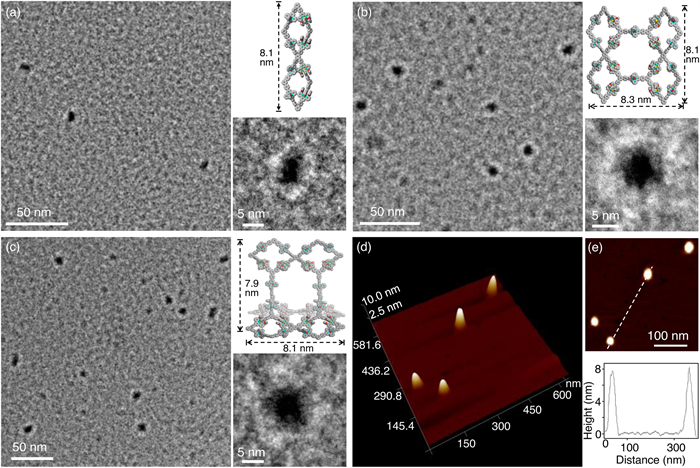 | Fig. 6. TEM characterization and theoretical model of the energy-minimized structures of supramolecules (a) R1, (b) R2, and (c) R3; (d, e) AFM image of supramolecule R3. | |