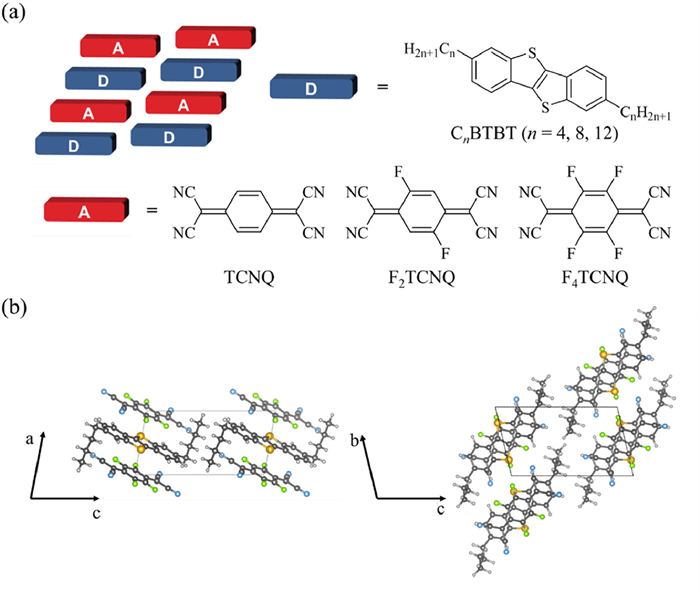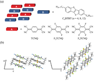 | Fig. 1. (a) Schematic diagram of the mix-stacked pattern of CnBTBT–FmTCNQ (denoted as CnFm, the same below) and the involved donors and acceptors in this work. (b) Crystal structure of C4F4 as an example of the CnFm CTC crystal series. | |