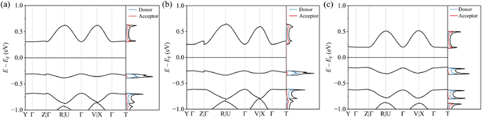 | Fig. 2. The calculated band structure and density of states of (a) C4F0, (b) C4F2, and (c) C4F4, respectively. The fermi level is set to 0 eV. | |