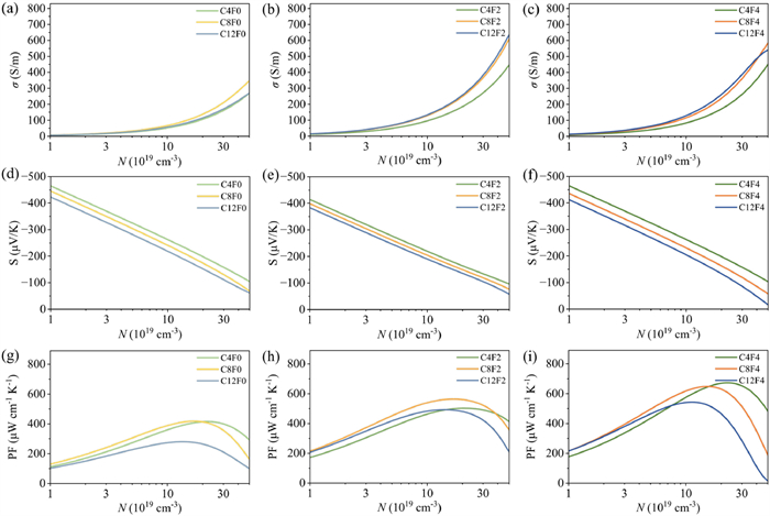 The incorporation of fluorine atoms into the TCNQ acceptor moiety is more effective than alkyl chain modification for enhancing the n-type thermoelectric performance of these CnFm complexes. This “electronic tuning” via fluorination profoundly impacts several key factors. Firstly, increasing “m” systematically enhances the electron affinity of the acceptor molecule, thereby promoting a more significant degree of charge transfer (DCT, Fig. S2 in Supporting information) and strengthening the intermolecular electronic coupling [45,46]. This is directly reflected in a general trend of decreasing π–π stacking distances (dπ–π, Fig. S1 in Supporting information) and, more importantly, an increase in the effective electronic transfer integrals (Table 1) along the a-axis that is particularly evident when comparing CnF0 with CnF2 and CnF4. Secondly, Boltzmann-transport calculations reveal a substantial rise in σ upon fluorination: The σ of CnF2 is typically twice as high as that of CnF0, whereas CnF2 and CnF4 are comparable (Figs. 3a–c). The mobility of C8Fm is consistent with the experimental results in trend, that is, C8F2 has the largest mobility, which is comparable to that of C8F4, while C8F0 is much lower [13]. Finally, a consistent and significant reduction in the bandgap is observed with increasing fluorine substitution across all alkyl chain lengths, with the CnF4 exhibiting the narrowest bandgaps (Fig. S1). Such narrow bandgaps are beneficial for achieving higher intrinsic carrier concentrations or requiring lower doping levels to reach optimal thermoelectric performance.