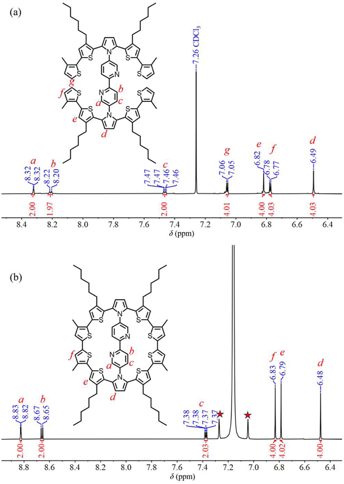 Macrocycles (4T-2hexyl-2Me)2-DPBP and (4T-2hexyl)2-DPBP were successfully synthesized through a series of reactions from commercial starting material [2,2′-bipyridine]−5,5′-diamine, including Paal Knorr, Wohl-Ziegler, Suzuki coupling, and Scholl reactions in commendable total yields of 17% and 16% (Scheme 1). Our stepwise synthesis strategy referred to the previously reported synthesis methods for macrocyclic molecules which may be adapted to relevant synthesis with more functional groups and ideal yields [23,24,38,39]. Details can be found in Supporting information. [2,2′-Bipyridine]−5,5′-diamine and 2,5-dimethoxytetrahydrofuran were dissolved in glacial acetic acid and heated to reflux, obtaining DPBP with a yield of 67%. DPBP and N-bromosuccinimide (NBS) were dissolved in a component solvent of DCM and THF at ambient temperature, yielding DPBP-Br4 with a 76% efficiency. Suzuki coupling reactions of DPBP-Br4 with 2-(3-hexylthiophen-2-yl)-4,4,5,5-tetramethyl-1,3,2-dioxaborolane facilitated by K2CO3 and Pd(PPh3)4, produced compound 1 (75%). Furthermore, the room temperature reaction of NBS with 1 yielded compound 2 (84%). Another Suzuki coupling reaction of compound 2 with either 2-thiopheneyl boronic acid or 4,4,5,5-tetramethyl-2-(3-methylthiophen-2-yl)-1,3,2-dioxaborolane, conducted at 120 ℃, yielded 3a (65%) and 3b (62%). FeCl3 was used to oxidize 3a and 3b, obtaining (4T-2hexyl-2Me)2-DPBP in an 80% yield and (4T-2hexyl)2-DPBP in an 80% yield. All the synthesized intermediates and products were characterized by 1H and 13C NMR spectroscopy and high-resolution mass spectrometry. 1H NMR spectroscopy (Fig. 1) revealed distinct differences between 3a and (4T-2hexyl-2Me)2-DPBP. The DPBP moiety in both 3a and (4T-2hexyl-2Me)2-DPBP is flanked by two half-oligothiophene rings, while the H atoms of bipyridyl moiety exhibit similar peaks in 1H NMR spectra. The disappearance of the d peak at the g site in 3a, along with the transformation of the d peak at f positions in 3a transforms into a singlet peak in (4T-2hexyl-2Me)2-DPBP, confirms the formation of (4T-2hexyl-2Me)2-DPBP and its high symmetry. Analogous spectral changes are observed in the 1H NMR spectra of 3b and (4T-2hexyl)2-DPBP. The disappearance of the standard dd peak at the g site in 3b implies the successful synthesis of (4T-2hexyl)2-DPBP. The thermogravimetric analysis (TGA) indicates that the decomposition temperature of both (4T-2hexyl-2Me)2-DPBP and (4T-2hexyl)2-DPBP is above 300 ℃. To better understand the synthesis process and the absolute structure, single crystals suitable for X-ray diffraction analysis were grown. Single crystals of 3a, obtained by recrystallization from ethanol, were yellow block crystals and belonged to the P-1 space group of the triclinic system. Unexpectedly, the thiophene groups did not form a quasi-ring in crystals, while the 1H NMR spectrum indicated a high degree of symmetry in solution. These observations strongly suggest that the macrocycle-closing reaction occurs in the solution rather than the solid state.