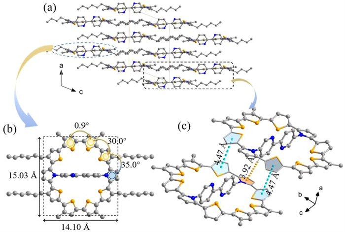 | Fig. 2. (a) Crystal structure of (4T-2hexyl-2Me)2-DPBP as seen from b axis. (b) Molecular structure of (4T-2hexyl-2Me)2-DPBP. (c) The C–H···π interactions and the distance of thiophene groups in adjacent molecules. The hydrogen atoms, solvent molecules as well as the partial alkyl chains are omitted for clarity. | |