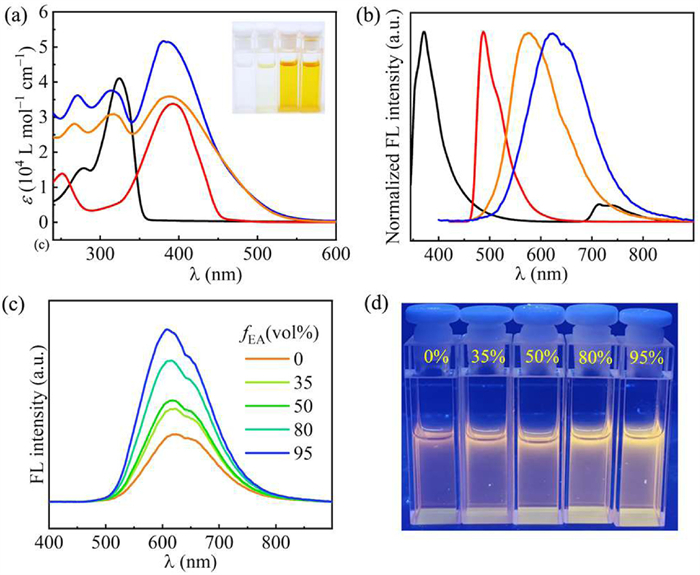 | Fig. 3. (a) UV–vis absorption spectra (c0 = 5 × 10–5 mol/L) and (b) normalized fluorescence emission spectra of DPBP (black), α−4T (red), (4T-2hexyl-2Me)2-DPBP (blue), and (4T-2hexyl)2-DPBP (orange) dissolved in DCM. Inset: Photograph of DPBP, α−4T, (4T-2hexyl-2Me)2-DPBP, and (4T-2hexyl)2-DPBP (left to right) in natural light. (c) Emission spectra of (4T-2hexyl-2Me)2-DPBP with the excitation wavelengths λex = 385 nm. (d) Photograph of (4T-2hexyl-2Me)2-DPBP in DCM/EA system under 365 nm UV light. | |