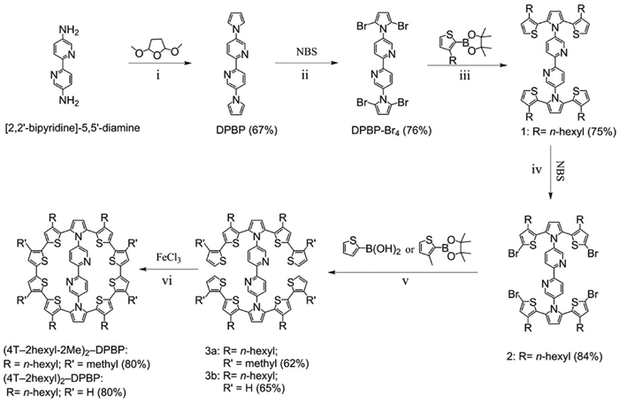 | Scheme 1. Synthesis route of (4T-2hexyl-2Me)2-DPBP and (4T-2hexyl)2-DPBP. (ⅰ) 2,5-Dimethoxytetrahydrofuran, glacial acetic acid, reflux, 24 h; (ⅱ) NBS, THF/DCM, room temperature, overnight; (ⅲ) Pd(PPh3)4, K2CO3, dioxane/H2O, 120 ℃, 3 days; (ⅳ) NBS, DCM, −116 ℃, overnight; (ⅴ) Pd(PPh3)4, K2CO3, dioxane/H2O, 120 ℃, 4 days; (ⅵ) FeCl3, DCM, room temperature, overnight. | |