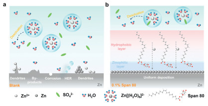 Herein we introduce a novel nonionic surfactant featuring ultra-long carbon chains with 18 carbons, sorbitan oleate (Span 80) (Fig. S1 in Supporting information) can achieve long-cycle-life AZIBs, which structure is characterized by infrared spectroscopy (Fig. S2 in Supporting information). As shown in Fig. 1a, severe side reactions are observed in the blank electrolyte. In contrast, the hydrophilic sorbitan group of Span 80 anchors onto the Zn anode surface, which effectively regulates Zn2+ deposition uniformity (Fig. 1b). Simultaneously, the ultra-long hydrophobic carbon chains form a robust interfacial layer at the Zn-electrolyte interface, effectively suppressing hydrogen evolution reactions (HER). Owing to these synergistic mechanisms, the adverse side reactions on the Zn anode surface are significantly mitigated. As a result, Span 80 additive confers extraordinary stability, with symmetric cells functioning steadily for over 570 h at a high current density of 50 mA/cm2. Furthermore, in a Zn||V2O5 full cell configuration, the addition of Span 80 markedly enhances cycling performance, delivering 179 mAh/g after 2000 cycles, while also significantly improving rate capability. These findings demonstrate that constructing a hydrophobic interfacial layer with ultra-long carbon chains offers an effective and straightforward strategy for developing high-efficiency Zn-based energy storage devices with enhanced cycling stability.