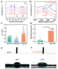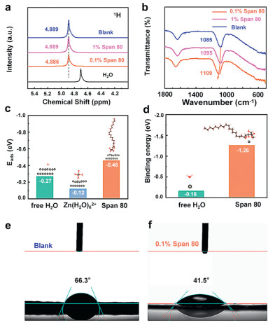 | Fig. 2. Theoretical study on Span 80. (a) 1H NMR and (b) FTIR of electrolyte with different Span 80 concentrations. (c) Adsorption energy of free H2O, [Zn(H2O)6]2+ and Span 80 molecules on Zn surface. (d) Binding energy of Zn with Span 80 and H2O. (e, f) Contact angle of blank and 0.1% Span 80 electrolyte additive on Zn foil surface. | |