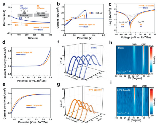 | Fig. 3. Electrochemical performance of different batteries. (a) CA curves of Zn anode in different electrolyte at 20 mV. (b) CV curves of Zn||Cu cells. (c) Tafel curves of Zn||Zn cells. (d, e) LSV curves. (f, g) In-situ EIS spectra of the Zn||Zn symmetrical cells with/without Span 80 additive. (h, i) In-situ XRD patterns of Zn anode using different electrolyte. | |