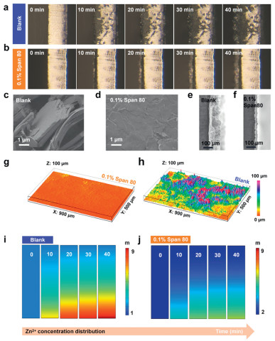 | Fig. 4. Zn deposition morphologies in different electrolytes. (a, b) In situ optical microscopy images of Zn anodes deposited for 30 min using blank electrolyte and 0.1% Span 80 electrolyte at 5 mA/cm2. SEM of Zn anode on the top view and side view of blank electrolyte (c, e) and 0.1% Span 80 additive (d, f) after 30 cycles at 1 mA/cm2 and 1 mAh/cm2. 3D CLSM images of Zn anodes with (g) 0.1% Span 80 additive and (h) blank additive after 30 cycles at 1 mA/cm2 and 1 mAh/cm2. (i, j) The finite element simulation (FEM) in different electrolytes of Zn2+ concentration distribution. | |