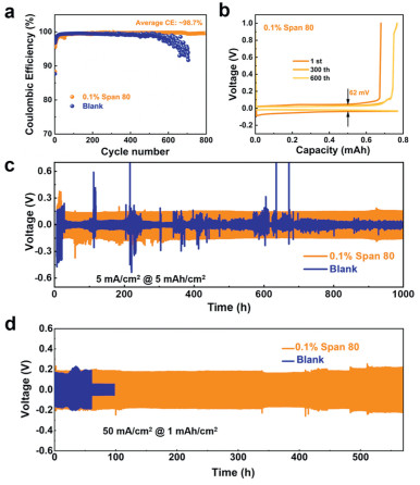 | Fig. 5. Electrochemical performance of the half cells. (a) Coulombic efficiency of Zn||Cu asymmetric cells in different electrolytes at 0.5 mA/cm2 and 0.5 mAh/cm2. (b) Voltage profiles of Zn plating/stripping in 0.1% Span 80. Long-term cycling performance of Zn||Zn symmetric cells in electrolyte with/without Span 80 (c) 5 mA/cm2, 5 mAh/cm2 and (d) 50 mA/cm2, 1 mAh/cm2. | |