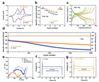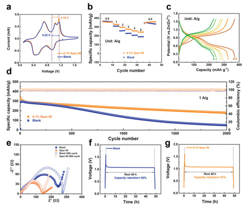 | Fig. 6. Electrochemical performance of the Zn||V2O5 full cell. (a) CV curves in electrolyte with/without Span 80. (b) Rate performances and (c) charge/discharge curves. (d) Long cycle performance at 1 A/g. (e) EIS spectra in different electrolytes. Self-discharge curves of Zn||V2O5 cells in (f) blank electrolyte and (g) 0.1% Span 80 electrolyte. | |