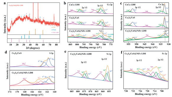 | Fig. 2. Physical characterizations of CoCu LDH, Co3S4/CuS and Co3S4/CuS@NiFe LDH: (a) XRD pattern, XPS spectra of (b) Co 2p, (c) Cu 2p, (d) S 2p, (e) Ni 2p and (f) Fe 2p. | |