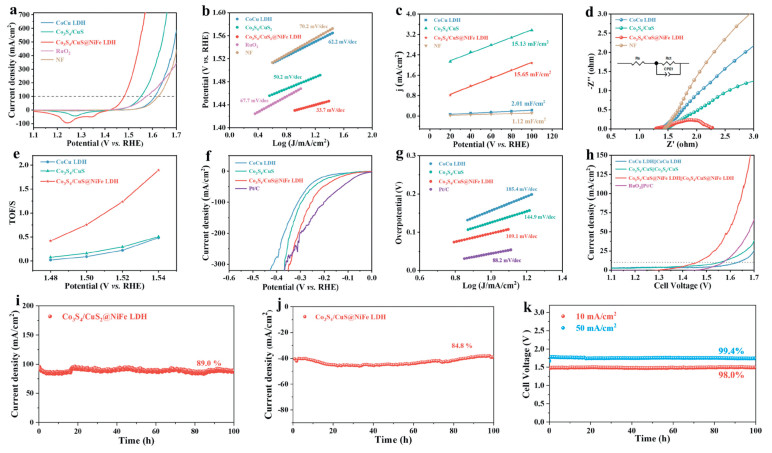 | Fig. 3. OER, HER and OWS performances of CoCu LDH, Co3S4/CuS, Co3S4/CuS@NiFe LDH, RuO2, Pt/C and NF: (a, f, h) LSV plots, (b, g) Tafel slope, (c) Cdl values, (d) Nyquist plots, (e) TOF values, (i, j) i-t curves, (k) CP curves. | |