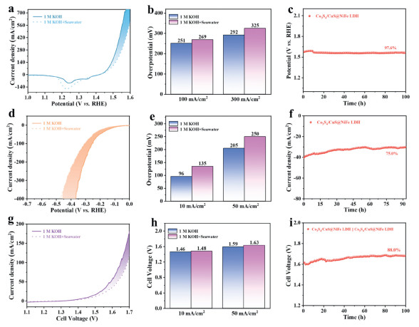 | Fig. 4. Catalytic performance of Co3S4/CuS@NiFe LDH in natural alkaline seawater for OER, HER and OWS: (a, d, g) LSV curves, (b, e) overpotential comparison charts, (h) cell voltage comparison chart and (c, f, i) stability testing curves. | |