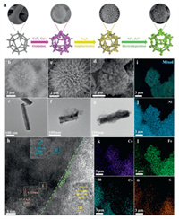 | Fig. 1. (a) Synthesis illustration. SEM images and TEM images of (b, e) CoCu LDH, (c, f) Co3S4/CuS and (d, g) Co3S4/CuS@NiFe LDH. (h) HRTEM image with selected magnified areas (Ⅰ, Ⅱ and Ⅲ) and (i-n) elemental mapping images of Co3S4/CuS@NiFe LDH. | |
