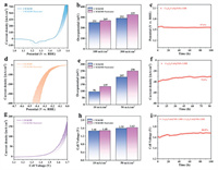 The performance of Co3S4/CuS@NiFe LDH electrocatalysts is further evaluated in seawater to meet the demands of industrial applications [64]. In Figs. 4a and b, the OER performance of Co3S4/CuS@NiFe LDH in alkaline seawater is almost the same at low current densities compared to the OER test results in 1 mol/L KOH. There is only a difference of 18 and 33 mV between the two at 100 and 300 mA/cm2. Furthermore, the stability testing manifests that the OER performance of Co3S4/CuS@NiFe LDH is essentially unchanged for 100 h, indicating that natural alkaline seawater has little effect on the OER performance of the electrocatalyst (Fig. 4c). Figs. 4d and e show that the HER performance of Co3S4/CuS@NiFe LDH is slightly degraded owing to the presence of Cl− and potential toxicity from other microorganisms in seawater [24]. And Co3S4/CuS@NiFe LDH still displays impressive performance in the stability test of HER at 90 h (Fig. 4f).