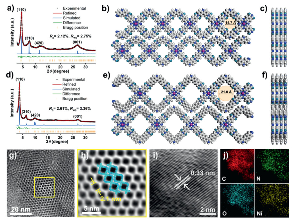 | Fig. 1. PXRD patterns of (a) NiPc-CZDM-COF and (d) NiPc-CZDL-COF. Simulated structures of (b, c) NiPc-CZDM-COF and (e, f) NiPc-CZDL-COF (C: grey; N: blue; O: cyan; Ni: pink; H: white). (g-i) HRTEM images of NiPc-CZDL-COF. (j) EDS mapping photos of NiPc-CZDL-COF. | |