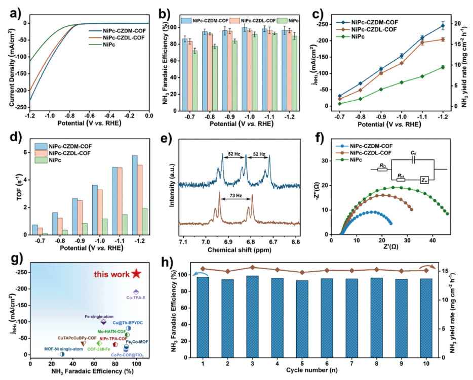 | Fig. 3. (a) LSV curves, (b) FENH3, (c) jNH3 and NH3 yield rate, (d) TOF of the two COF and NiPc. (e) 1H NMR spectra of electrolyte after using K14NO3 and K15NO3 as the nitrogen source. (f) Nyquist plots of NiPc-CZDM-COF, NiPc-CZDL-COF and NiPc. (g) Comparison of FENH3 and jNH3 with other reported catalysts. (h) Cyclic electrocatalytic test of NiPc-CZDM-COF. | |