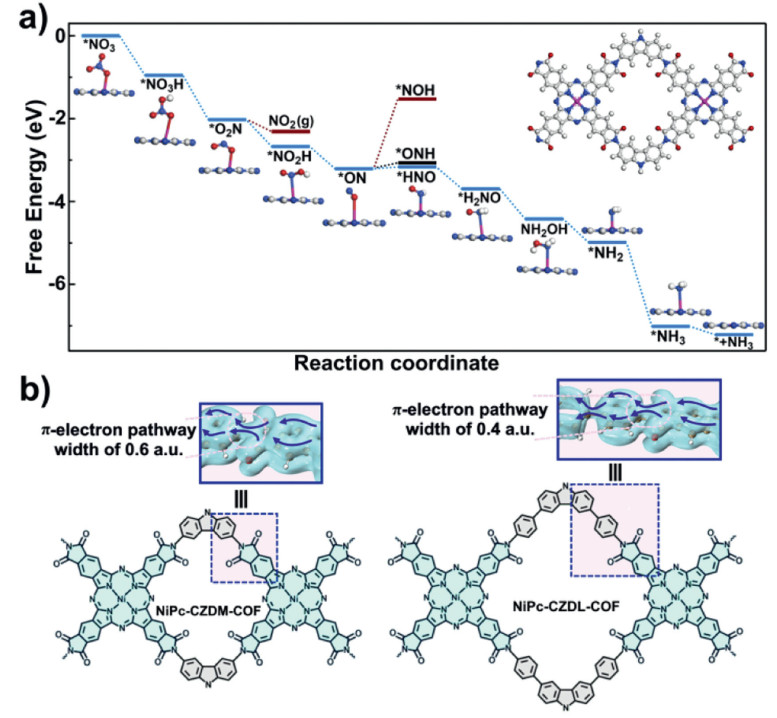 | Fig. 4. (a) Energy pathway towards the NO3RR for NiPc-CZDM-COF. (b) The π-electron pathways of NiPc-CZDM-COF and NiPc-CZDL-COF evaluated by the π-Mayer bond order theory. | |