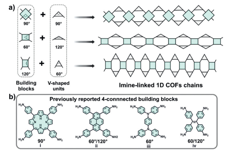 | Scheme 1. Schematic structures of (a) building blocks, V-shaped linking units, and (b) topological structures of 1D imine-linked COFs reported thus far. | |