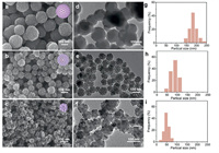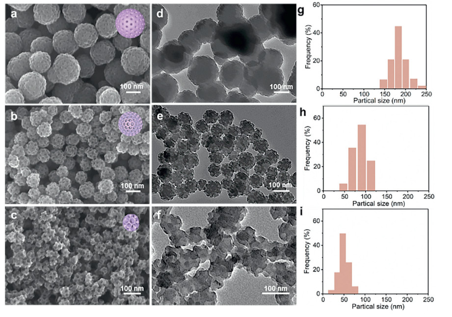 | Fig. 2. Microstructure and morphology of prepared mPPy nanospheres. (a-c) SEM images, (d-f) TEM images and (g-i) particle size distribution of the synthesized samples. | |
