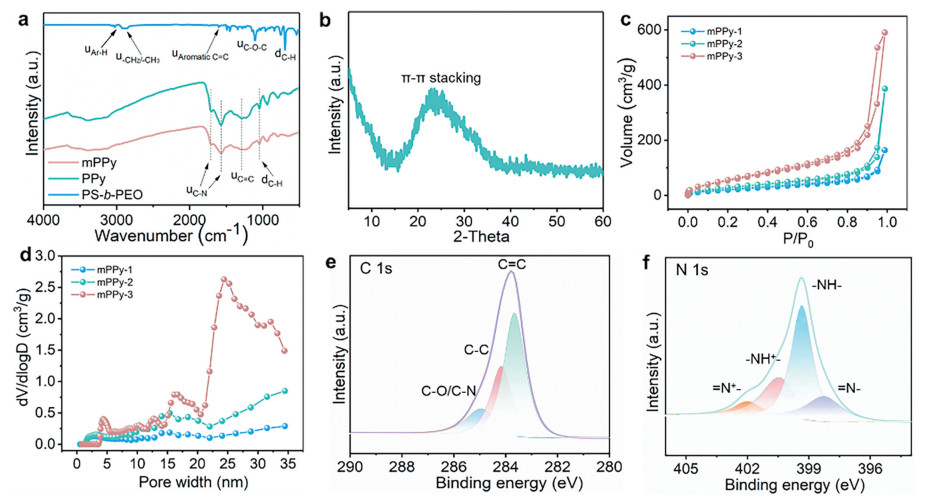 | Fig. 3. (a) FTIR spectra of PS-b-PEO, PPy, mPPy. (b) XRD patterns of mPPy. (c) N2 adsorption-desorption isotherm and (d) pore size distribution of mPPy. XPS spectra of (e) C 1s and (f) N 1s of mPPy. | |