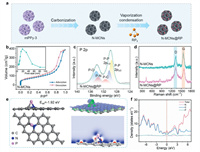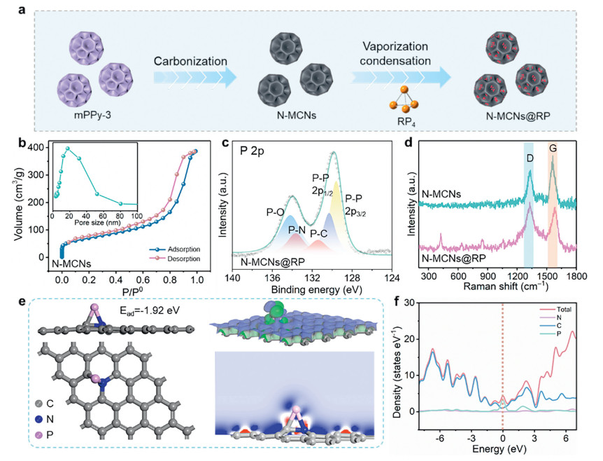 | Fig. 4. (a) Schematic illustration of the synthesis process for the N-MCNs@RP composite. (b) N2 sorption isotherms of N-MCNs. (c) XPS spectra of P 2p of N-MCNs@RP composites. (d) Raman spectra of N-MCNs and N-MCNs@RP composite. (e) Adsorption energy and corresponding charge density difference of N-MCNs@RP composite. (f) Density of states analysis for N-MCNs@RP composite. | |