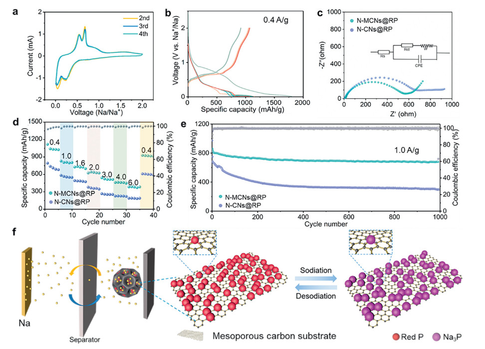 | Fig. 5. (a) CV curves of the N-MCNs@RP composite half-call at a scan rate of 0.1 mV/s. (b) Discharge/charge profiles of the N-MCNs@RP composite electrode between 0.01 V and 2 V at a current density of 0.4 A/g. (c) EIS plots of the N-MCNs@RP composite electrode. (d) The rate performance of the N-MCNs@RP and N-CNs@RP composite electrodes at the current densities of 0.4–6.0 A/g. (e) The long cycling stability of the N-MCNs@RP and N-CNs@RP composite electrodes at 1.0 A/g. (f) Illustration of the discharge/charge processes of N-MCNs@RP in Na ions half batteries. | |