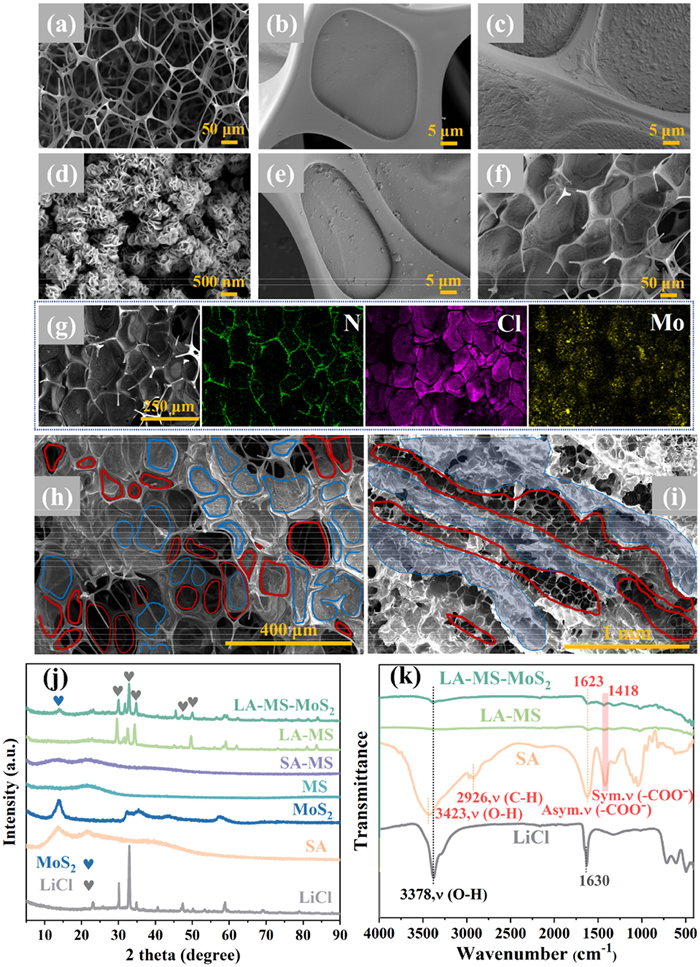 | Fig. 1. The morphological structure and chemical composition of the samples. (a) MS. (b) SA-MS. (c) LA-MS. (d) MoS2. (e) SA-MS-MoS2. (f) LA-MS-MoS2 surface (small scale). (h) LA-MS-MoS2 surface (large scale). (i) Cross-section of LA-MS-MoS2 SEM images. (g) EDS mapping spectrum of LA-MS-MoS2. (j) XRD pattern and (k) FT-IR spectrum of prepared samples. | |