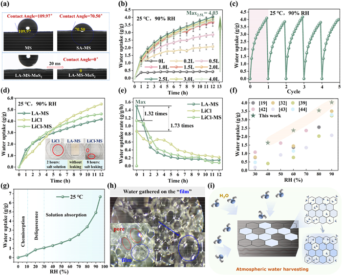 Subsequently, the promotion mechanism of hygroscopic performance has been further explored. As shown in Fig. 2g, the water vapor sorption isotherms of LA-MS-MoS2 at 25 ℃ are consistent with those of salt-based composite sorbents reported in previous studies [31,41], which shows physical adsorption from 0 to 11% RH, deliquescence of the salt around 30% RH, and finally absorption by the salt solution. Furthermore, we directly observed the in situ hygroscopic process of LA-MS-MoS2 by optical microscope (Fig. 2h). Initially, the water vapor diffused from the high-humidity air to the surface of the composite adsorbent; and then the surface gradually became moist and chemical adsorption occurred due to the introduced hygroscopic salt LiCl; the increasing amount of moisture gradually turned into salt solution, which was gathered and stored on the "films". Additionally, water molecules passed through the pore channels into the internal layers and thus water adsorption was also taken place orderly, and the hygroscopic process was similar to the surface structure. Therefore, micro/millimeter-scale "pores" could act as transport channels of water vapor, providing a convenient path to the internal of adsorbent, which reduces mass transfer resistance in comparison with solid or single-pore-sized adsorbents. Moreover, the porous structure provided more internal surface area to increase the contact between water vapor and the adsorbent, thereby significantly improving the diffusion and mass transfer rate of water vapor. On the other hand, the micro/millimeter-scale "films" contributes to the uniform distribution of hygroscopic salt LiCl, which promotes the convergence and storage of moisture on the "films", and thus solving the problem of salt solution leakage. The unique "pore-film" structure not only increase the adsorption quantity of water but also enhance water storage capacity, realizing the efficient and persistent atmosphere water adsorption. The schematic diagram of atmosphere water adsorption on LA-MS-MoS2 is illustrated in Fig. 2i.