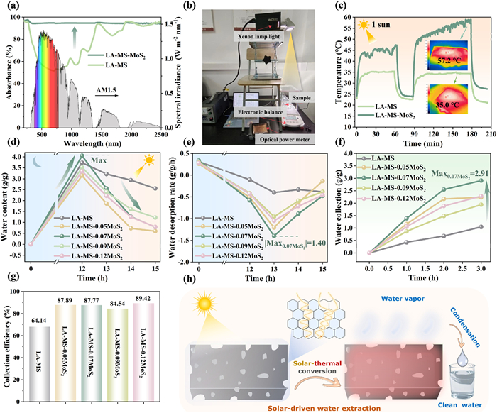 | Fig. 3. Performance of solar-driven water production the prepared samples. (a) The solar light absorbance of LA-MS and LA-MS-MoS2. (b) The device for simulated solar-driven water desorption. (c) The surface temperature changes of LA-MS and LA-MS-MoS2 under simulated 1 sun irradiation, with samples containing different amounts of MoS2. (d) Water adsorption desorption curves. (e) Water desorption rates. (f) Amount of water collected. The data presented above are the mean values from three experiments. (g) Effective water collection efficiency and (h) Schematic diagram of solar-driven water production. | |