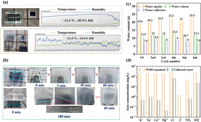 | Fig. 4. Solar-driven atmospheric water harvesting outdoor experiments. (a) Twelve pieces of LA-MS-MoS2 underwent atmospheric water adsorption for 12 h overnight (top) and water production through sunlight exposure for 3 h the following day (bottom), along with temperature and humidity changes. (b) A physical photo of solar-driven atmospheric water the next day. (c) Water uptake, water release, and water collection in six cyclic tests. (d) Water quality analysis. | |