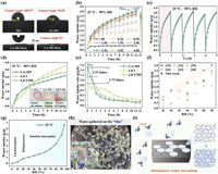| Fig. 2. Performance of water vapor adsorption of the prepared samples. (a) The contact angle of the samples. (b) The water vapor sorption kinetics of LA-MS loaded with different LiCl concentrations (0–4.0 mol/L) at 25 ℃, 90% RH. (c) The moisture adsorption cycling test of LA-MS (loaded with 2.5 mol/L LiCl) at 25 ℃, 90% RH. (d) The moisture adsorption performance test of LiCl powder (abbreviated as LiCl), LiCl solution directly impregnated onto MS samples (abbreviated as LiCl-MS), and LA-MS at 25 ℃, 90% RH, with the inset showing the corresponding moisture adsorption process and whether the salt solution leaked. (e) A comparison of the moisture adsorption rates of the samples in (d). (f) Moisture adsorption performance comparison of LA-MS with reported studies. (g) The water sorption isotherms of LA-MS-MoS2 at 25 ℃. (h) The optical microscope image of LA-MS-MoS2 during moisture adsorption and (i) Schematic of water vapor transport from ambient air to sorbents. light blue: LA "film", dark blue: water vaper adsorbed and aggregated on the LA "film". | |