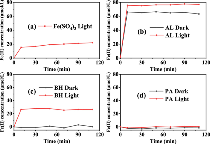 | Fig. 1. Photoproduction of Fe(Ⅱ) in the systems of Fe(Ⅲ) alone (a), Fe(Ⅲ) complexes with AL (b), BH (c) and PA (d) at pH 3.0. The total Fe(Ⅲ) (Fetot) was 100 µmol/L and PROC concentration was 12.5 mg/L. | |