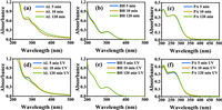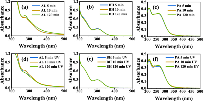 | Fig. 2. The UV-vis spectrum of solutions containing Fe(Ⅲ) with AL, BH and PA at pH 2.2 in the dark (a-c) and under UV irradiation (d-f), respectively. The Fetot concentration was 100 µmol/L and the PROC concentration was 25 mg/L. | |