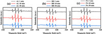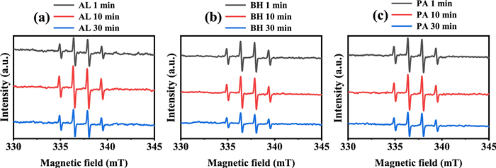 | Fig. 3. The EPR spectrum of Fe(Ⅲ) complexes with (a) AL, (b) BH and (c) PA at pH 2.2 under UV irradiation. The Fetot concentration was 100 µmol/L and the PROC concentration was 25 mg/L. | |
