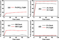 Without any organic ligands, UV irradiation facilitated the generation of Fe(Ⅱ) and the dynamic equilibrium between the photoreduction of Fe(Ⅲ) and the photooxidation of Fe(Ⅱ) by dioxygen culminated in a photo steady state, while Fe(Ⅲ)-OH complexes were the dominant light-absorbing species in the Fe2(SO4)3 solution [8,10]. At pH 3.0, FeOH2+ reaches its maximum concentration (Fig. S2 in Supporting information), making it the most significant iron species in the process of photoreduction. With a further increase in pH, the species become predominantly Fe(OH)2+. Then, a quantitative analysis was performed to compare the concentrations of Fe(Ⅱ) produced at a pH of 3.0 across various complexes of Fe(Ⅲ) bound to PROCs (Fig. 1). In the dark, the yield of Fe(Ⅱ) from the Fe(Ⅲ)-AL complex rapidly increased to 66 µmol/L within the first 10 min, but this was not the case for Fe(Ⅲ)-BH and Fe(Ⅲ)-PA complexes. Under UV illumination, the maximum yield of Fe(Ⅱ) from the Fe(Ⅲ)-AL and Fe(Ⅲ)-BH complexes surpassed that observed in the dark. Notably, the Fe(Ⅱ) yield from the Fe(Ⅲ)-BH complex was greater than that of Fe(Ⅲ) sulfate under identical conditions. Interestingly, no Fe(Ⅱ) formation was detected for Fe(Ⅲ)-PA complex either in the dark or under UV irradiation. The photoreduction of Fe(Ⅲ) was significantly impeded as the pH increased from 4.0 to 6.0 (Fig. S3 in Supporting information).